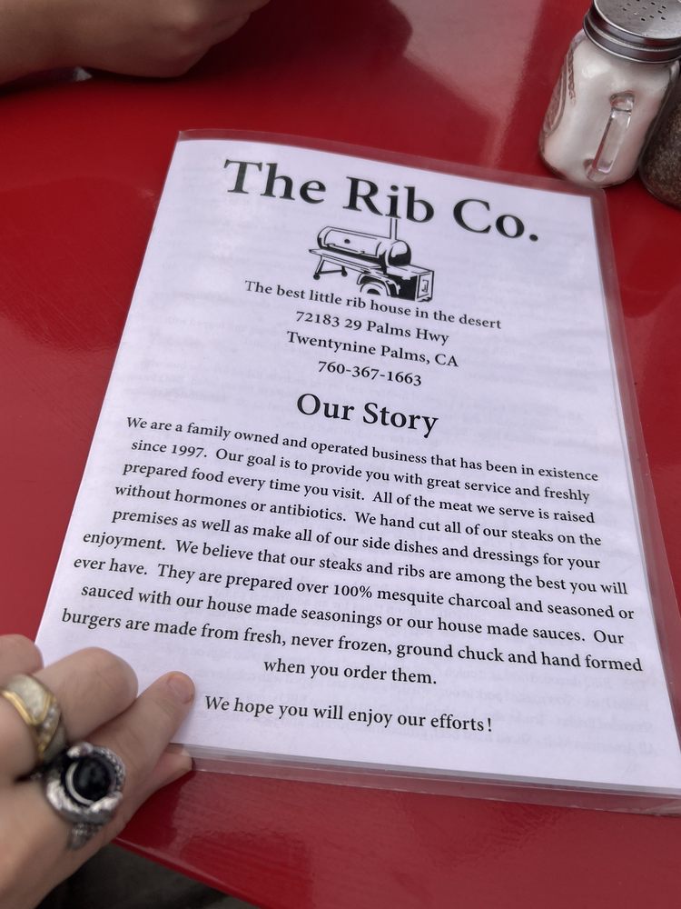 The Rib Co. in Twentynine Palms, CA, is a hidden gem specializing in delicious barbeque offerings. With a variety of ribs and sides, this place offers a cozy and relaxed atmosphere with indoor and outdoor seating options. The triple threat ribs, covered in house rub, BBQ sauce, and Tennessee whiskey glaze, are a must-try, cooked flawlessly and packed with flavor. The mac & cheese, coleslaw, and BBQ beans are also highly recommended sides. The service is friendly, although there may be some minor quirks with seating arrangements. The pricing is reasonable, considering the remote location near Joshua Tree National Park, making it a great spot for a satisfying meal in the high desert. Overall, The Rib Co. impresses with its delicious ribs, comforting sides, and chill vibes, making it a place worth revisiting.